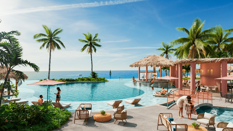 Bar y zonas asoleadoras tipo isla dentro de la piscina.
